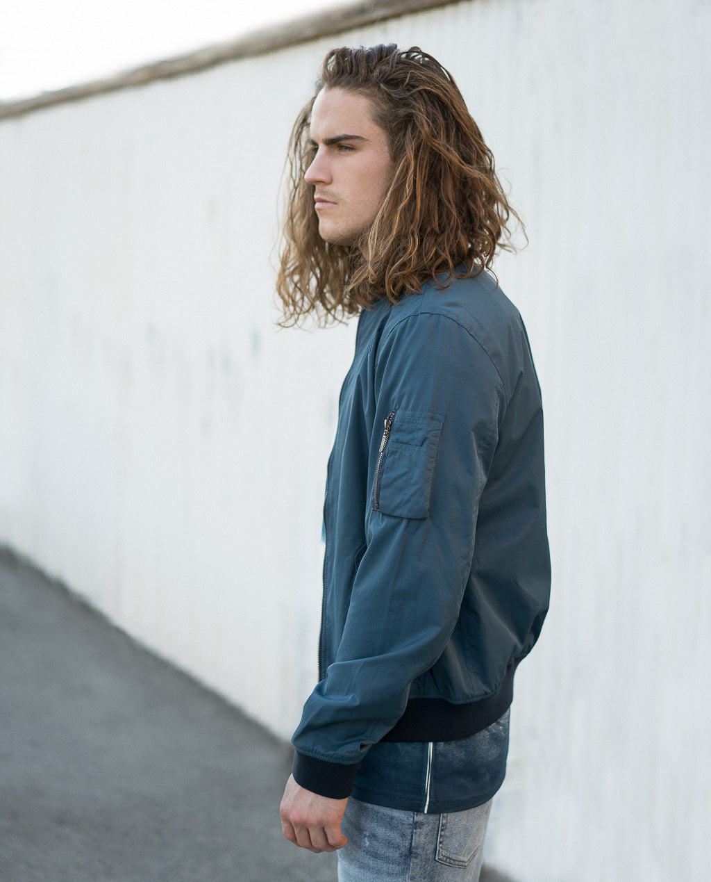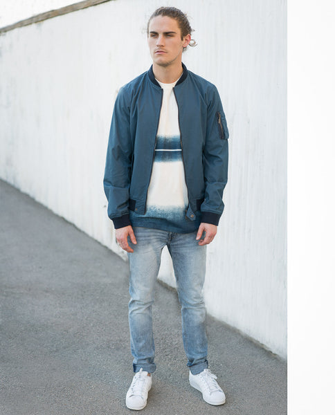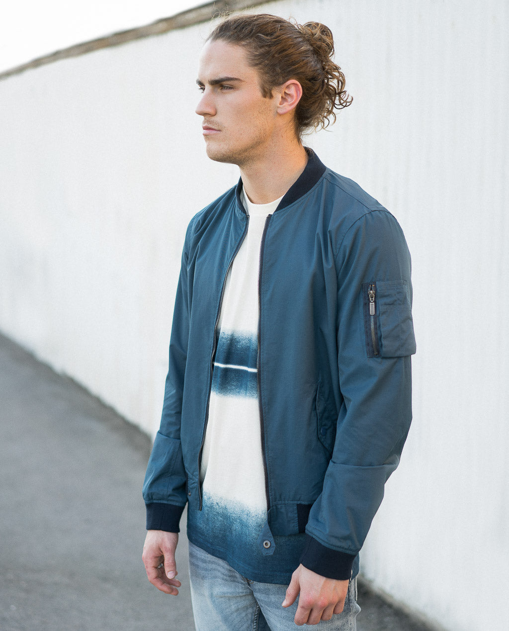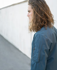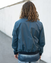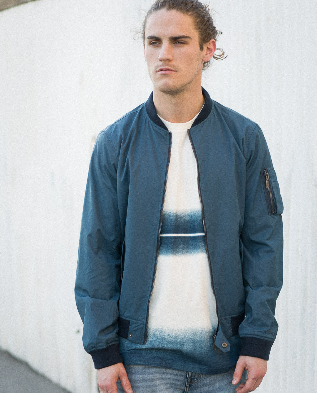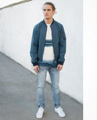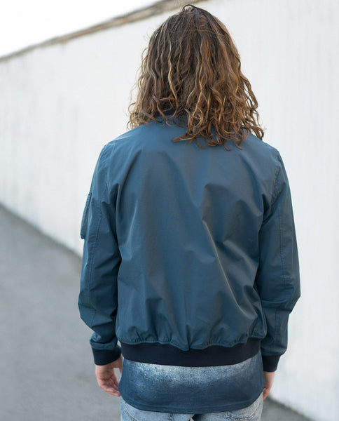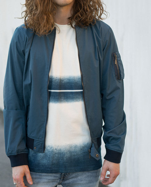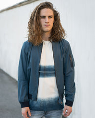 The Color Siete Celestial Bomber Jacket is bomber classic with a modern twist. Contrasting ribbing and special pocket on the sleeve, it can take you almost anywhere. —  Sleeve pocket / hip snap pockets — Ribbed Cuffs Partial Hem — Ribbed Stand Collar — Zipped Angled Pockets at Waist
