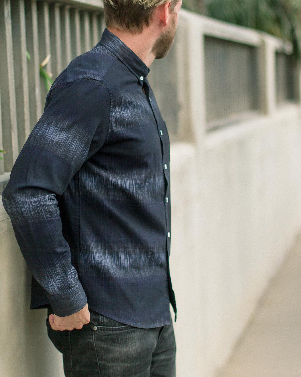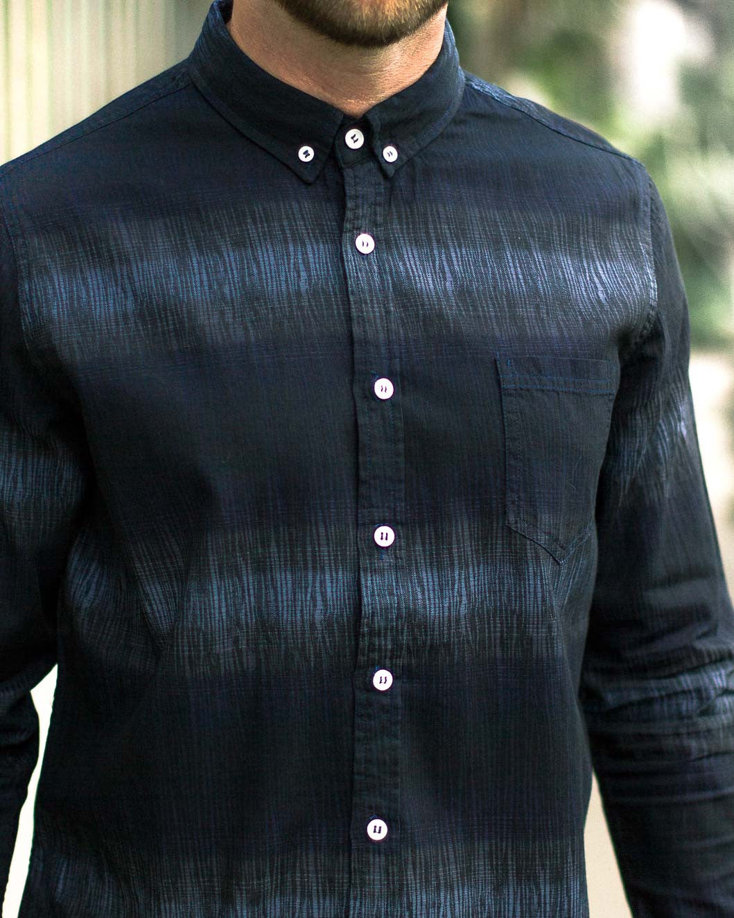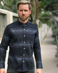 The Blue and Black design horizontal stripe design is woven in premium washed-cotton, styled with a button-down collar, chest patch pocket and 2-toned buttons. It has a comfortable, more boxy fit and the fabric has a very soft hand.