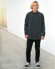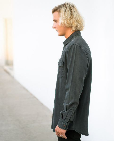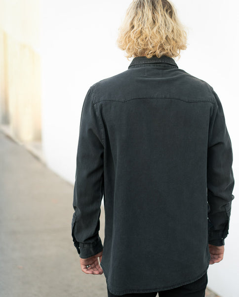 Rollas Midnight Rambler Shirt is slim fitting long sleeve black Denim shirt. It's made from light weight, high twill line soft denim. The style is washed back with a light stone wash with worn copper press studs for that authentic worn look. Wear it around on a Saturday while you run errands or on a night out. It's a quality MNML piece with a less is more approach. Style with your favorite piece of denim.