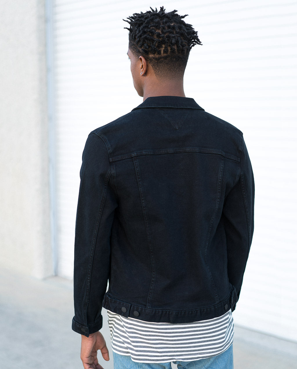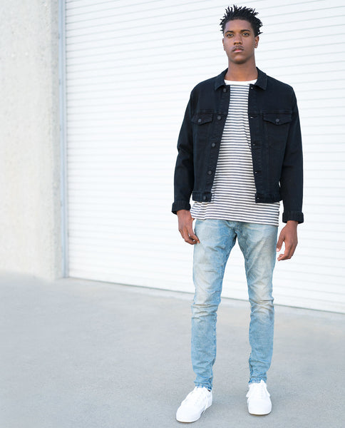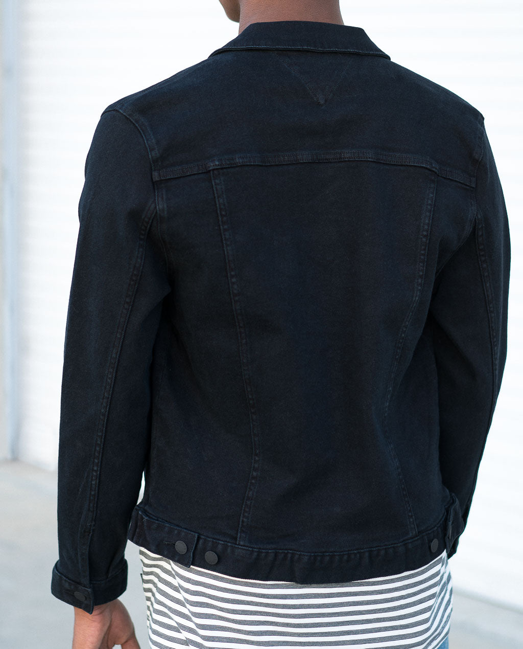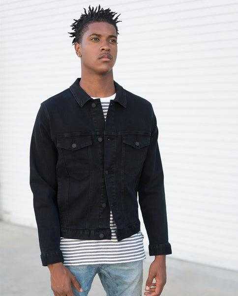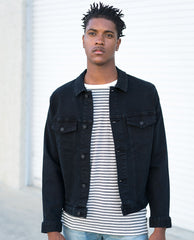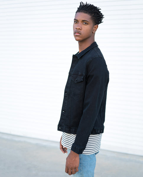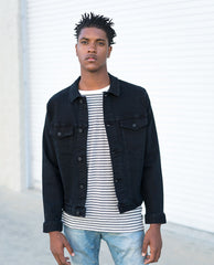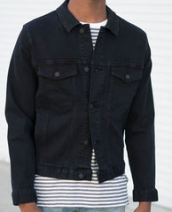 Easy fit denim jacket. Made from high density OE (Open End) stretch denim for a unique look and comfortable fit. The colourway Lightning Black is a nice deep black that has been rubbed back a bit around the edges and placket to give an edgier look.