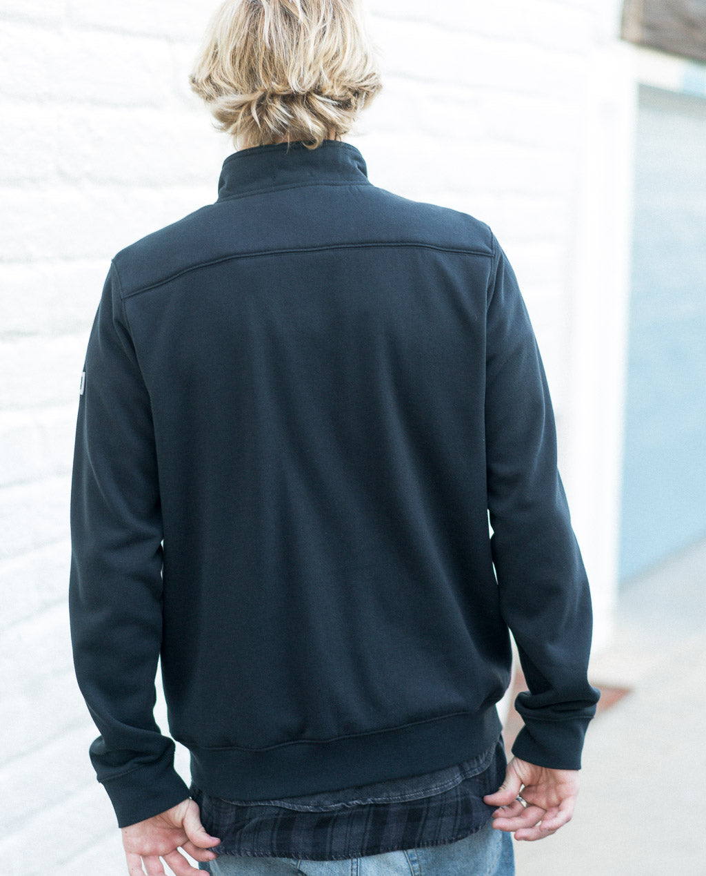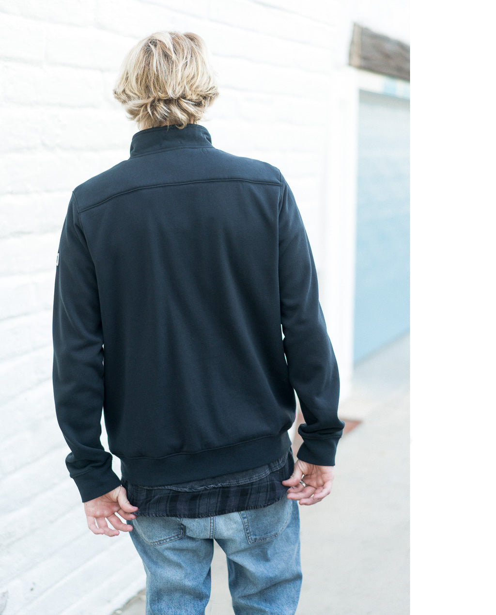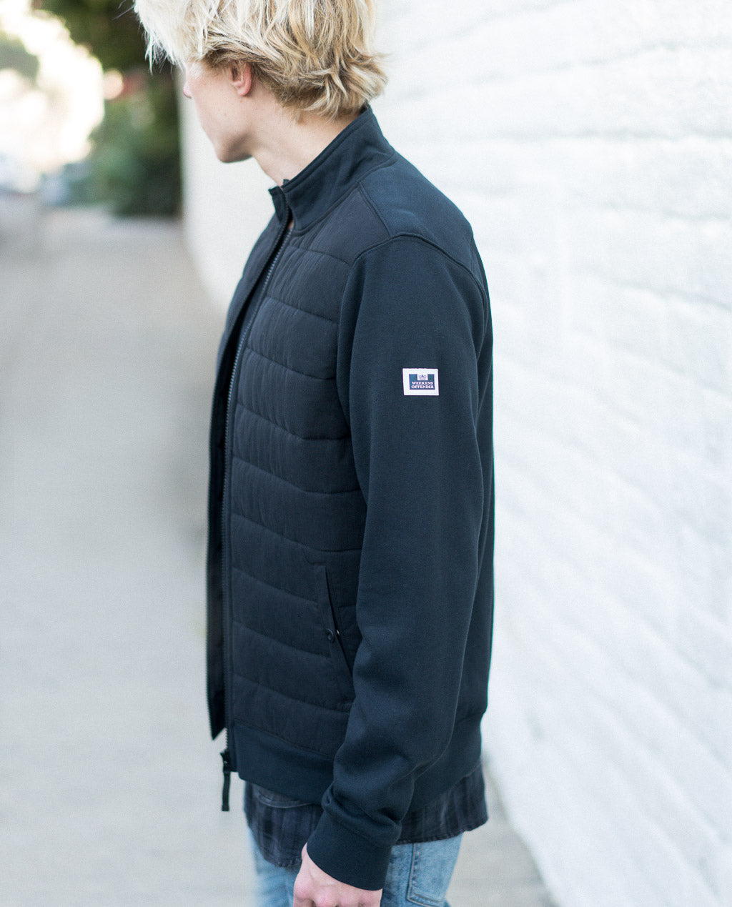 WEEKEND OFFENDER Wear Black Jacket is a fleeced track style lightweight jacket with a quilted woven cotton front. It is no-nonsense, terrace wear, styled after 80s casuals clothing with an insubordinate twist.