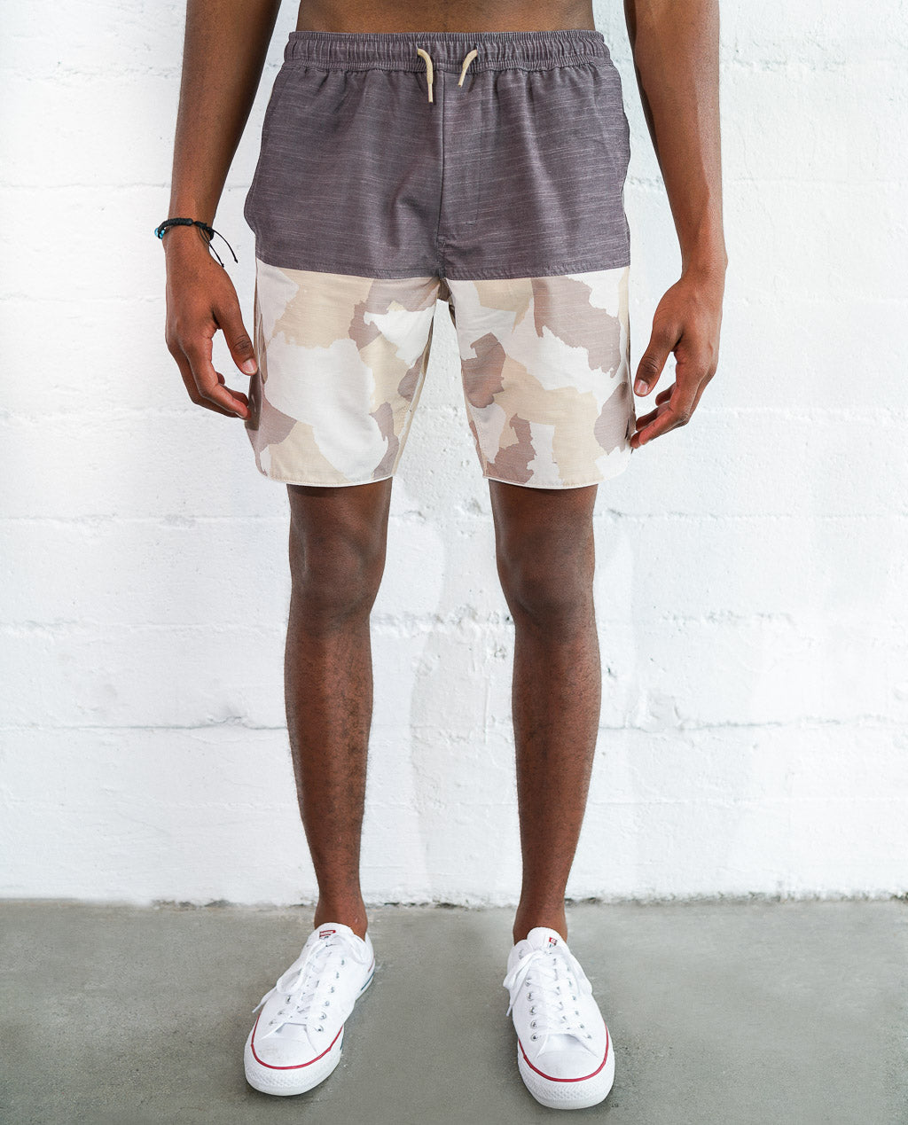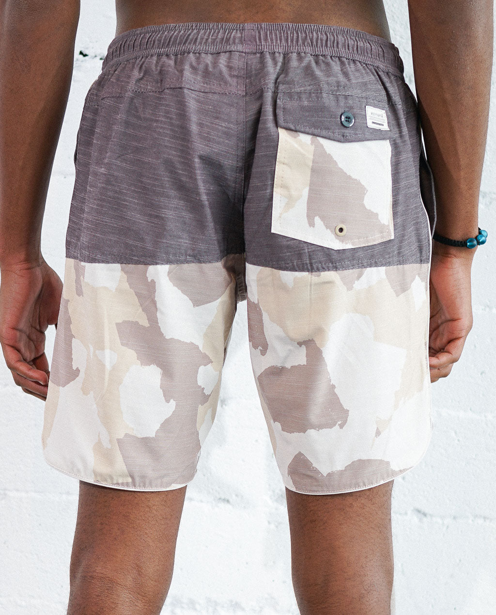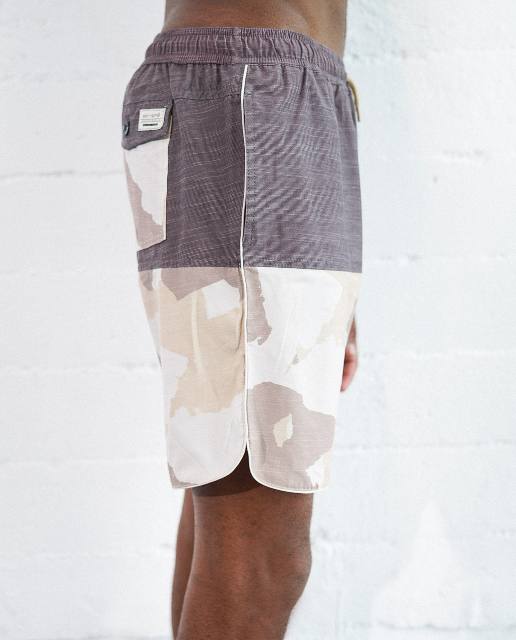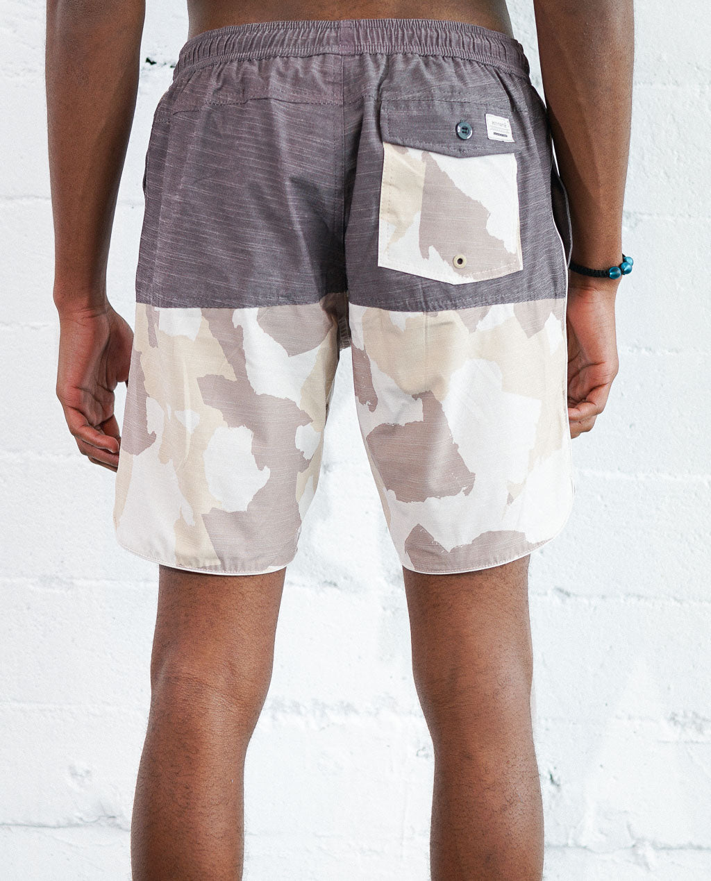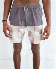 CAMO PATTERN WITH SOLID ON A TRANSITIONAL SWIM SHORT.