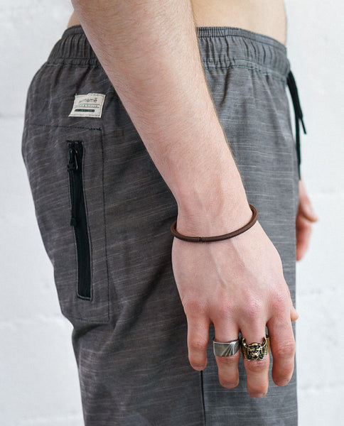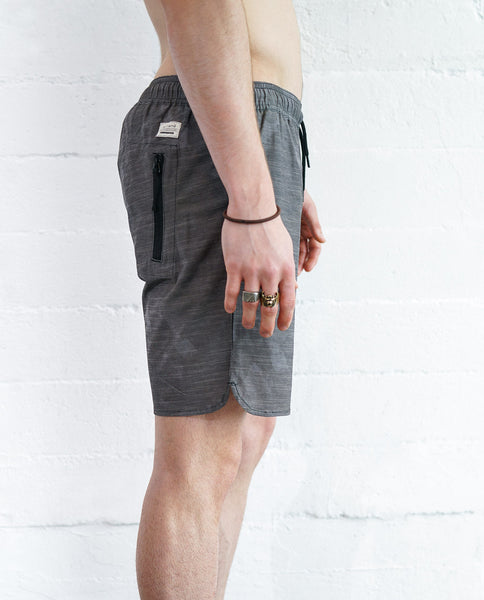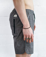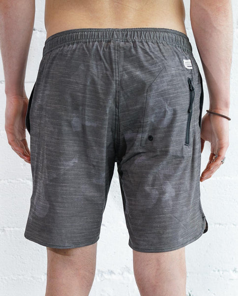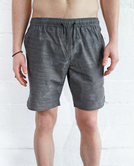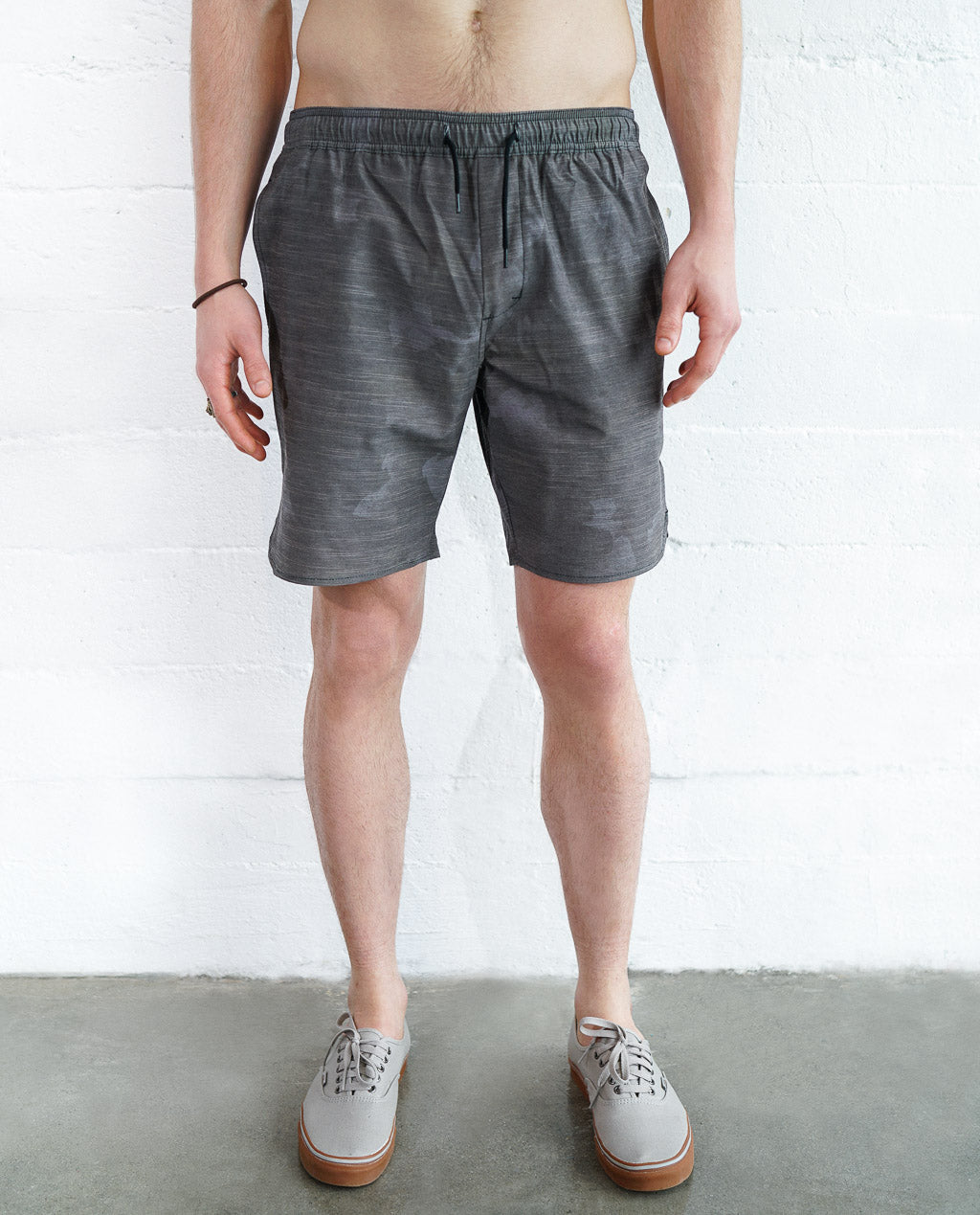 CAMO PATTERN ON A TRANSITIONAL SWIM SHORT.