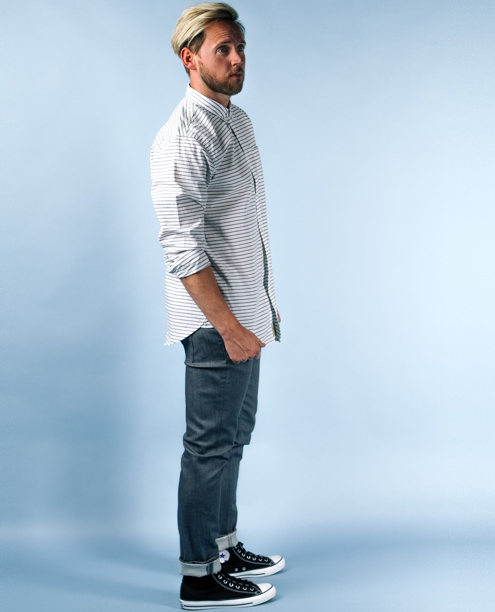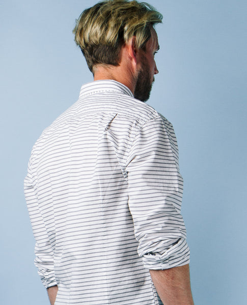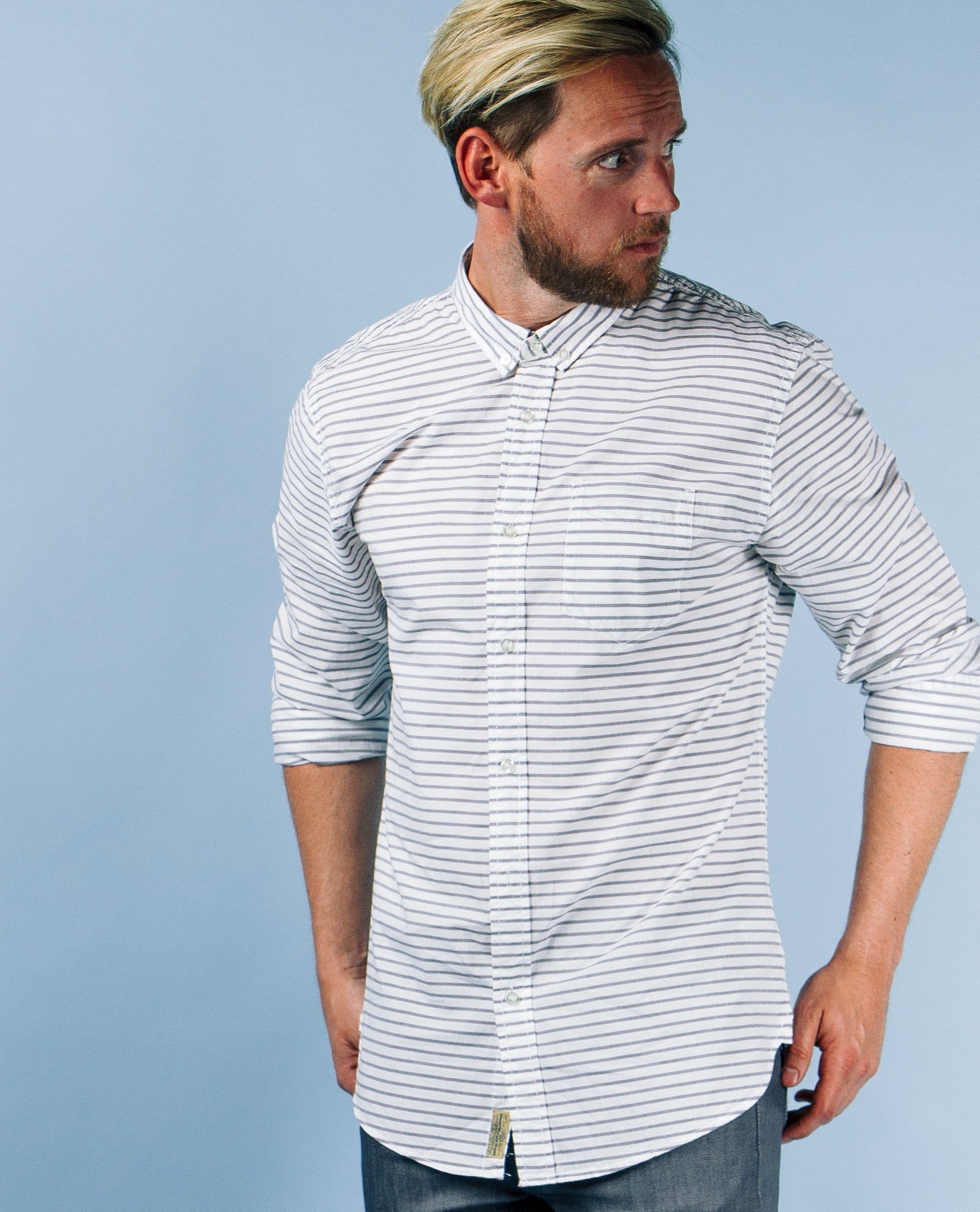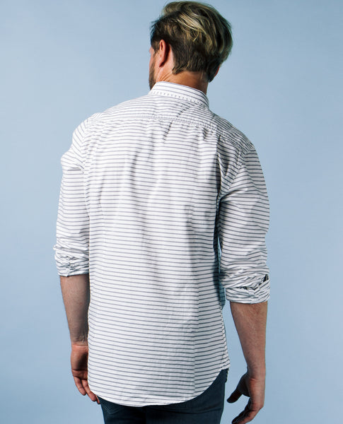 Grey Stripe White Buttonup Obviously can be worn a variety of ways. We recommend mixing it up with boots. Impeccably stylish, this pure cotton shirt in grey and white graph stripes features a sharp cut-collar, classic angled cuffs and a slim silhouette for an overall professional polish. It's not hard to see that this cotton striped shirt is more than the brand name implies. Slip it on and we can pretty much guess you'll be hard-pressed to take it off. Lightweight striped cotton knit. Point collar with button front placket. Long sleeves with single button cuffs. Button at upper arm for optional rolling. Make a stylish statement in this striped button down that's laid-back cool at its finest. Or wear it casual with a pair of old jeans. Just. Wear. It.