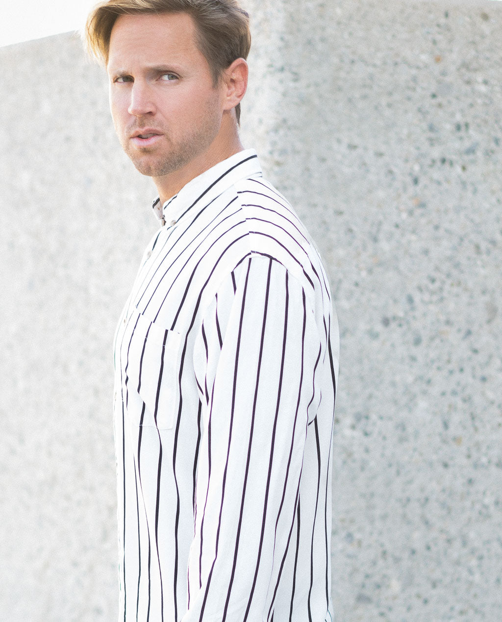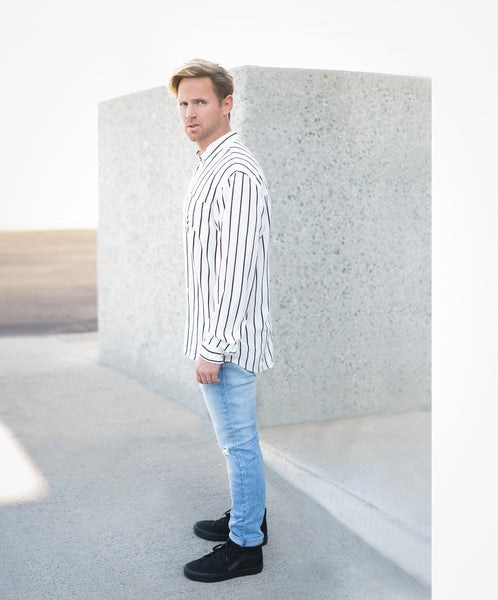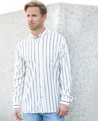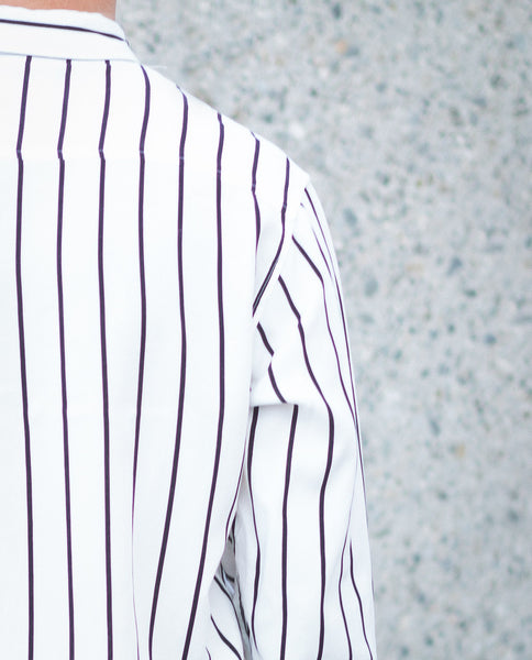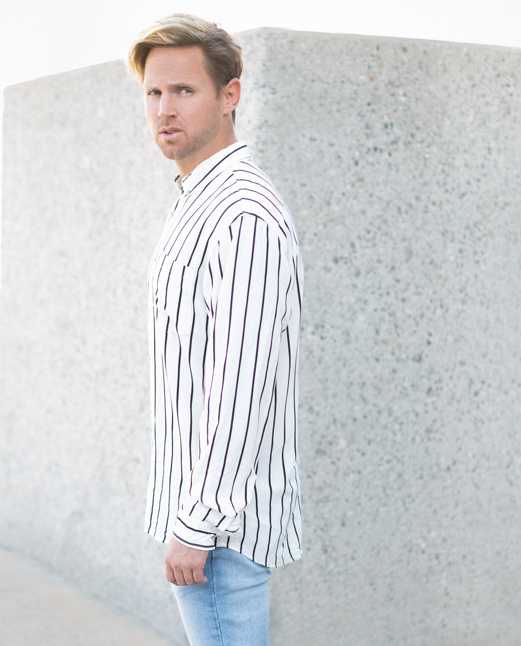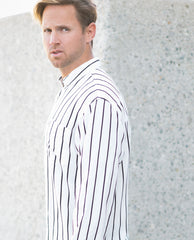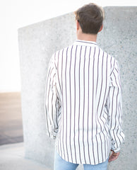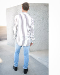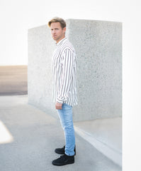 This Stripe Long Sleeve Shirt highlights this season’s penchant for easy-wearing silhouettes, with a contemporary twist. It’s made to a casual fitting silhouette for a slightly looser shape and is crafted from super lightweight Rayon. It features a classic point collar, button through front and an all-over black stripe print. Style it with the sleeves rolled up with your favorite denims for an urban look.