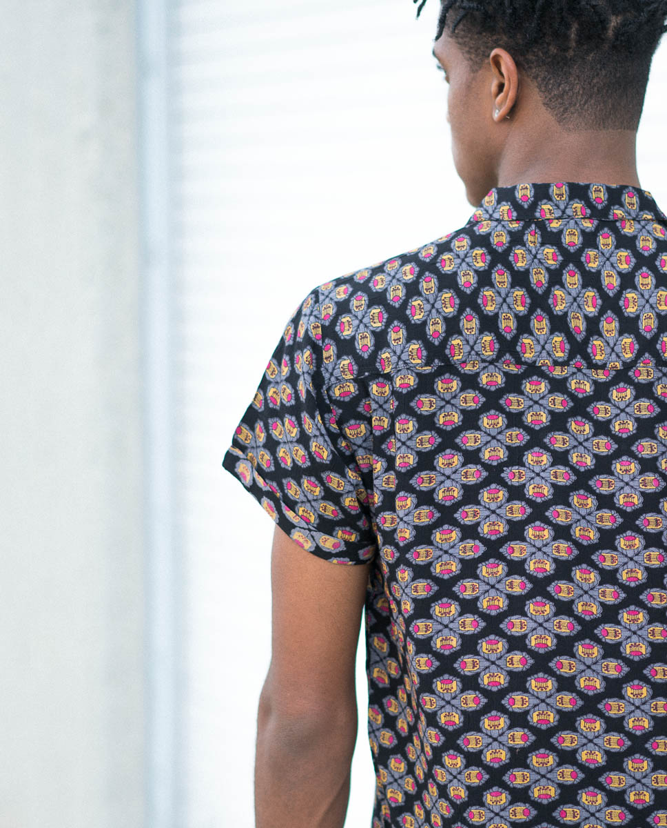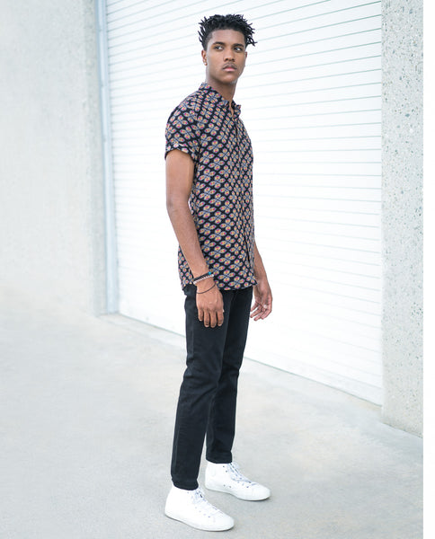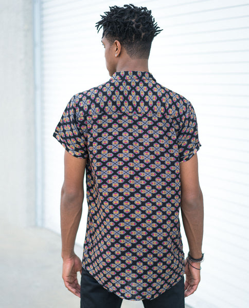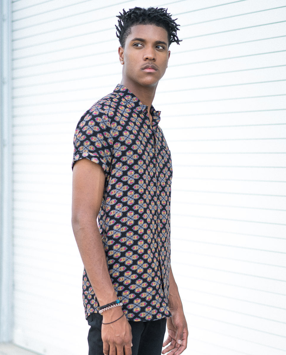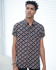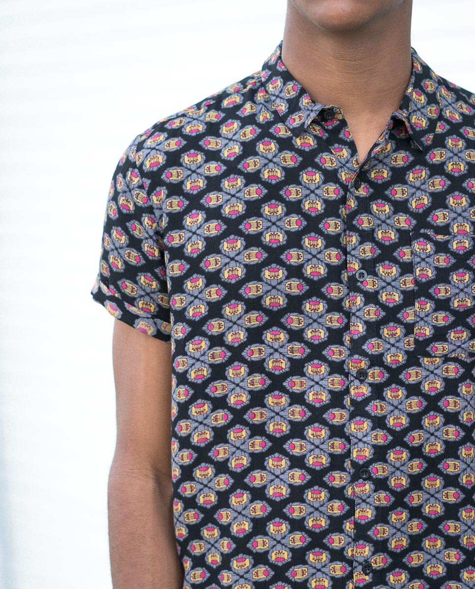 The Rollas Wallpaper Black Beach Boy Shirt has an authentic look. This style features tonal button detail, a chest pocket, regular collar, and allover print.