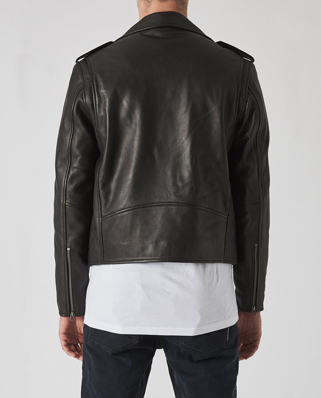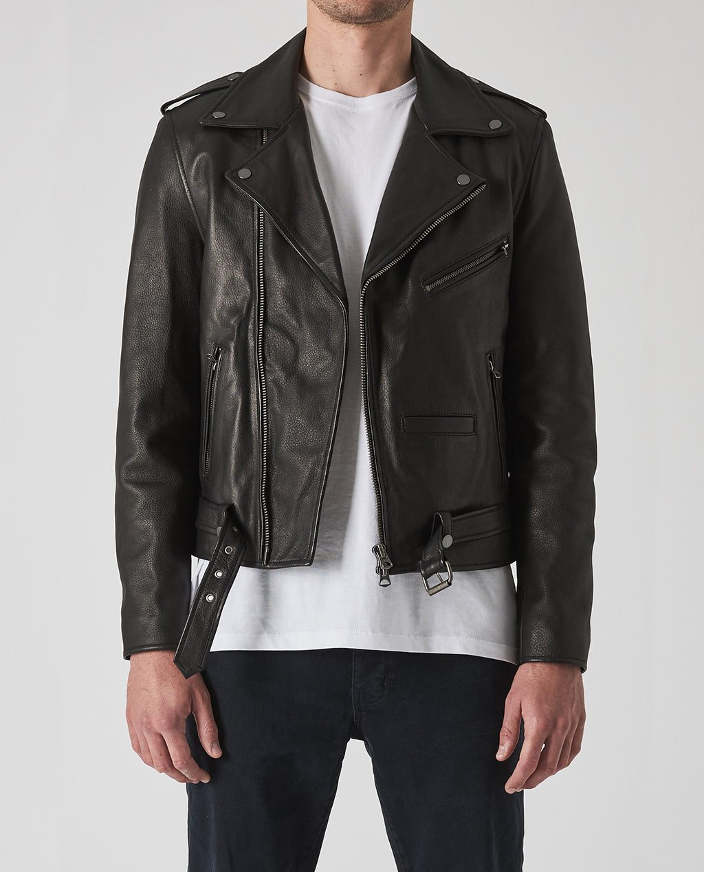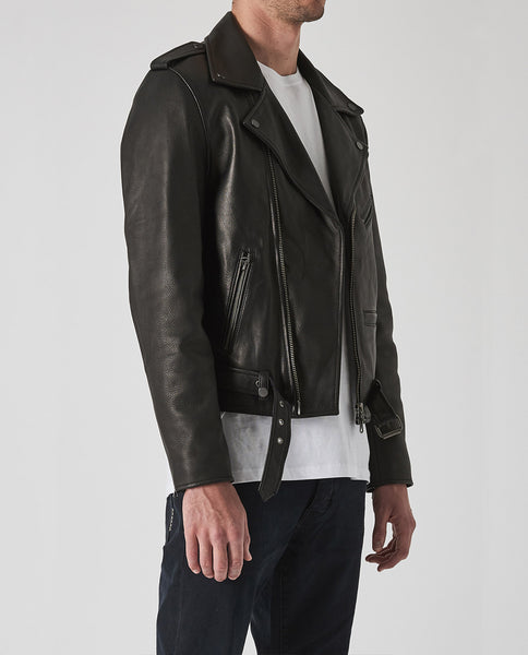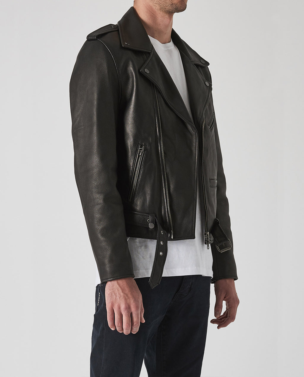Neuw Fitzroy Leather Jacket is made with the finest workmanship and is crafted from smooth Arabian lamb leather in a black colour way. This jacket features a comfortable, fitted silhouette, multiple zip pockets and a buckle fastening belt.