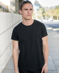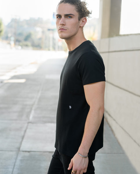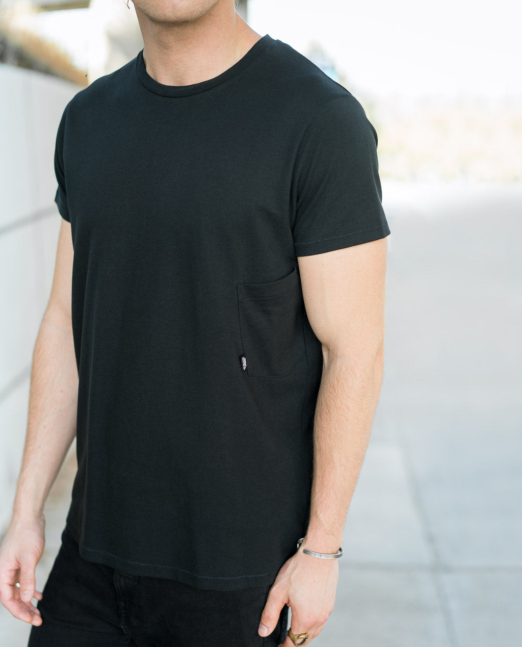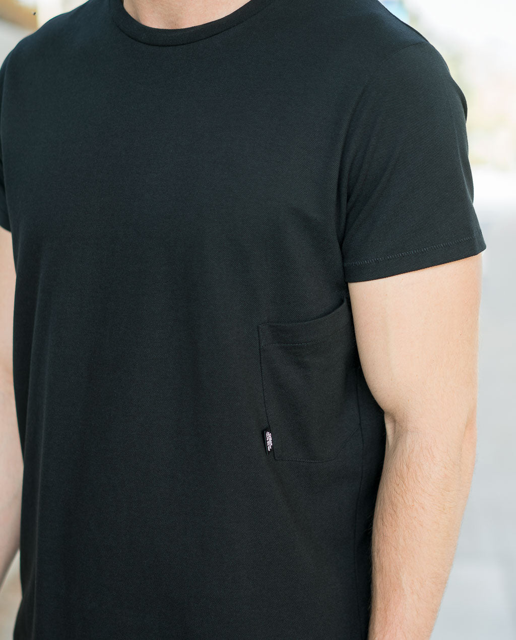 Tight-fit tee in soft pique fabric wth round neck, cap sleeves and pocket detail at side.