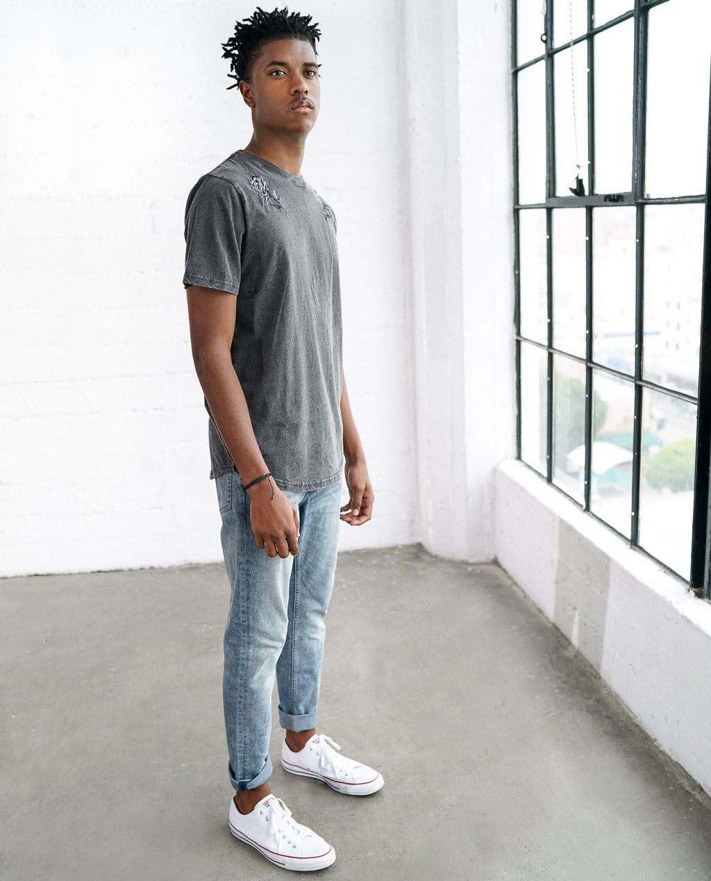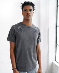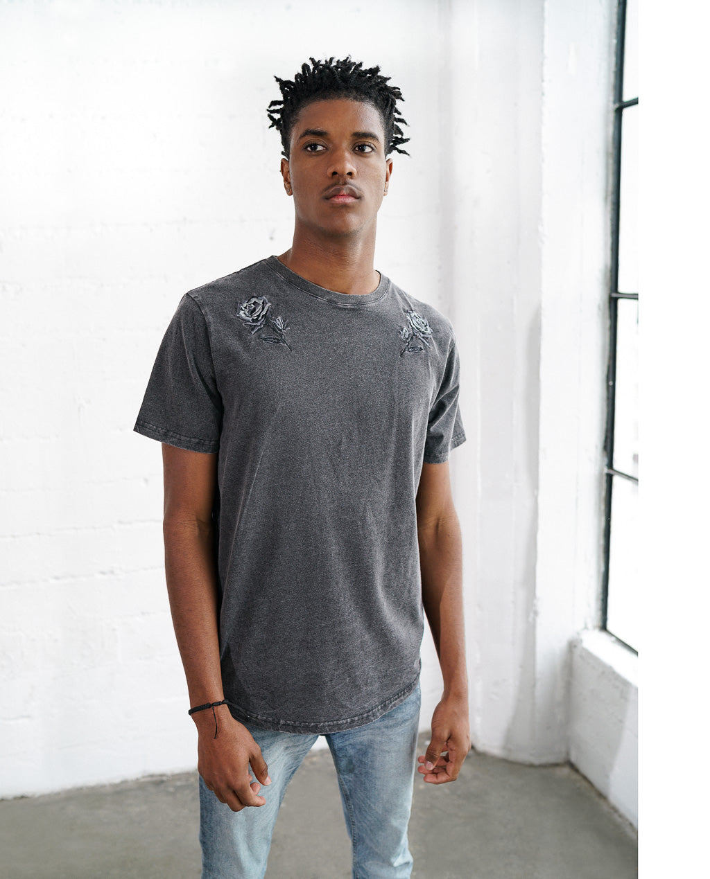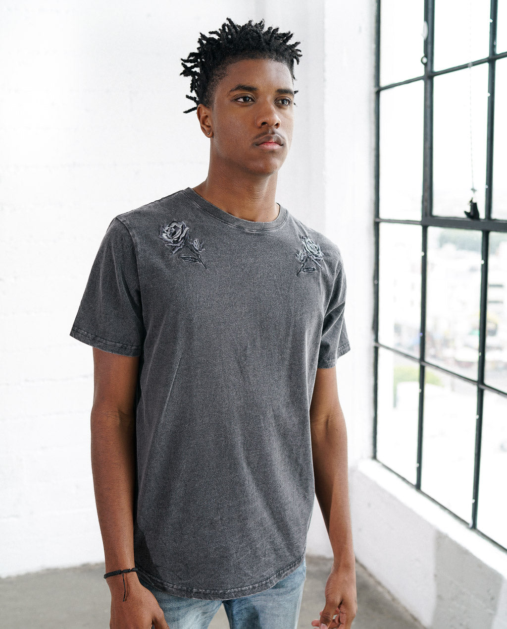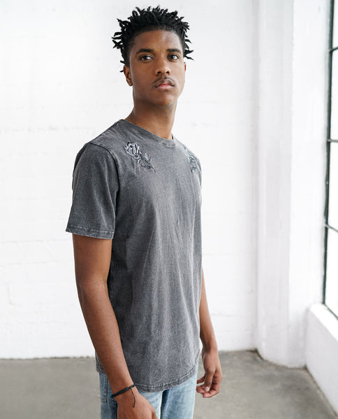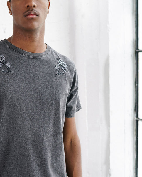 Nothing’s black and white --- it's all shades of gray...We totally dig anti-cheerful florals like this dope tee featuring a soft N’ stretchy construction, faded wash for a vintage look, embroidered logo on the bottom back, raw hems, and great fit with black and gray embroidered roses on the chest.
