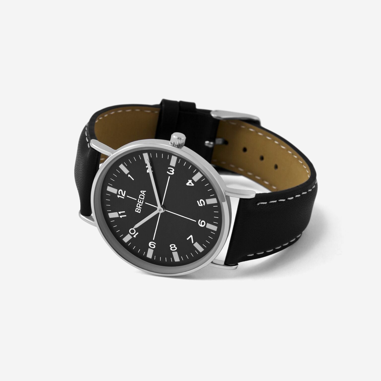 The Belmont Black Breda Watch could be worn with any look you are after. You get a lot of look at a decent price. The leather calfskin band and brushed black dial sells it every time. Black dial with contrasting silver case, silver hour markers, and matching hour and minute hands. White stitching along the genuine black leather strap and an adjustable silver buckle to close.